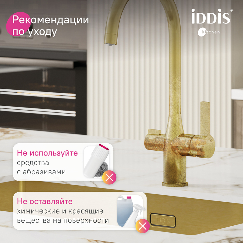 Трендовый золотой матовый смеситель для кухни Pure с J-изливом и отдельным каналом для подачи фильтрованной воды. Минималистичные элегантные формы для классических кухонь и кухонь в стиле прованс. Не требует дополнительного отверстия в мойке под фильтр. Можно подключить фильтр любого производителя и наслаждаться чистой водой прямо из смесителя – она удобно включается отдельной ручкой на корпусе. • Продумано до мелочей: угол открывания ручки – 110 градусов (30 градусов от себя – холодная вода, 80 на себя – горячая). Позволяет комфортно пользоваться смесителем и удобно регулировать температуру и напор. • Надежный корпус из прочной первичной латуни — стойкий к коррозии, резким изменениям давления и перепадам температуры воды. • Золотое PVD-покрытие нанесено методом вакуумного напыления, что обеспечивает высокую стойкость цвета. Гарантия на смеситель — 10 лет. (с) Авторский текст, апрель 2023 г.