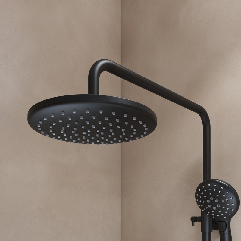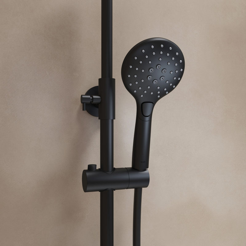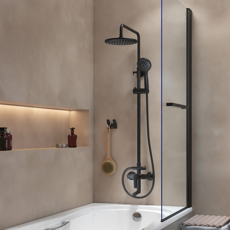 Смеситель с верхним душем из коллекции Ray в стильном черном матовом цвете – привлекательное, современное и практичное решение, которое будет органично сочетаться с любым дизайном ванной. • Керамический дивертор на стойке надежно и плавно переключает поток воды на верхнюю душевую лейку (Ø225 мм), трехрежимную ручную лейку (Ø110 мм) или поворотный излив. • Регулируемая высота стойки (от 800 до 1350 мм) позволяет принимать душ с комфортом даже самым высоким. • В комплекте душевые аксессуары: ручная лейка с держателем и гибкий шланг (1,5 м) для душа в металлической оплетке. • Смеситель IDDIS® прослужит долго благодаря надежному корпусу из прочной латуни, стойкому к коррозии, резким изменениям давления и перепадам температуры воды. • Цветное покрытие устойчиво к появлению царапин и выцветанию. На протяжении многих лет смеситель будет выглядеть как новый. Гарантия на смесители IDDIS® – 10 лет, на душевые аксессуары – 3 года. (с) Авторский текст, март 2023 г.