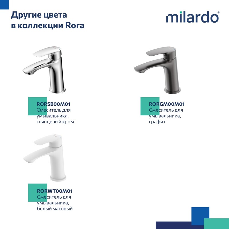 Смеситель для умывальника Rora отличается универсальным характером: основной акцент в его дизайне приходится на плавные линии корпуса и трендовый цвет. Модель в черном цвете одинаково выигрышно смотрится на контрастных белоснежных раковинах и дополняет собой однотонную керамику. Благодаря увеличенному выносу излива вода из смесителя поступает в раковину в самой удобной точке, что обеспечивает максимальную свободу движения в зоне умывания. В комплекте гибкая подводка и крепеж. • Качественный механизм смешивания воды смесителя Milardo® рассчитан на более чем 70 000 циклов работы – это не менее 15 лет эксплуатации семьей из трех человек. • Электрофоретическое матовое покрытие делает поверхность смесителя устойчивой к условиям высокой влажности – такой смеситель прослужит дольше и сохранит свой первоначальный внешний вид. • Встроенный аэратор легко извлекается из корпуса смесителя с помощью обычной монетки, что значительно упрощает его очистку. • Гарантия на смеситель Milardo® – 7 лет, на картридж – 3 года. (