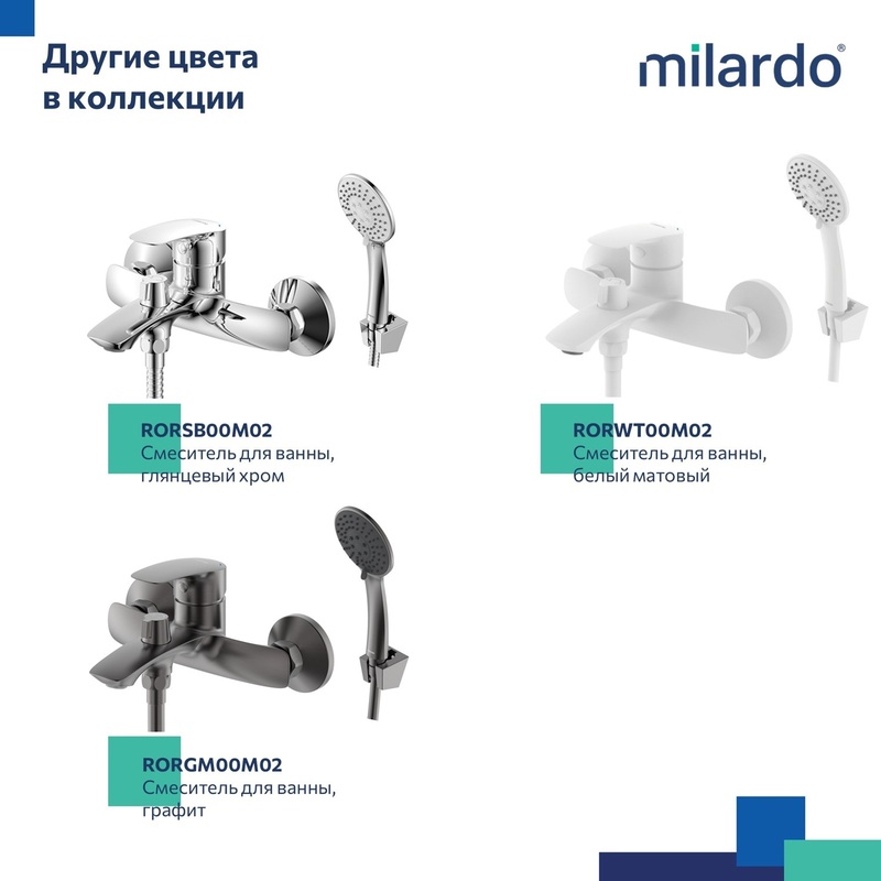 Смеситель для ванны Рора (Rora) отличается универсальным характером: основной акцент в его дизайне приходится на плавные линии корпуса и трендовый черный цвет. Модель с коротким фиксированным изливом надежна и удобна в ежедневном использовании. Интенсивность и температура потока легко регулируются удобной ручкой смесителя. Поворотный дивертор работает при любом давлении воды, переключая поток воды на большую душевую лейку (ø 100 мм) или в комбинированном режиме. • Ручная лейка из прочного ABS-пластика, ПВХ-шланг (1,5 м) в оплетке из нержавеющей стали и крепеж идут в комплекте. • Качественный механизм смешивания воды смесителя Milardo® рассчитан на более чем 70 000 циклов работы – это не менее 15 лет эксплуатации семьей из трех человек. • Электрофоретическое матовое покрытие делает поверхность смесителя устойчивой к условиям высокой влажности – такой смеситель прослужит дольше и сохранит свой первоначальный внешний вид. • Гарантия на смеситель Milardo® – 7 лет, на картридж – 3 года, на душевые аксессуары – 1 год. (с) Авторский текст, сентябрь 2022 г.