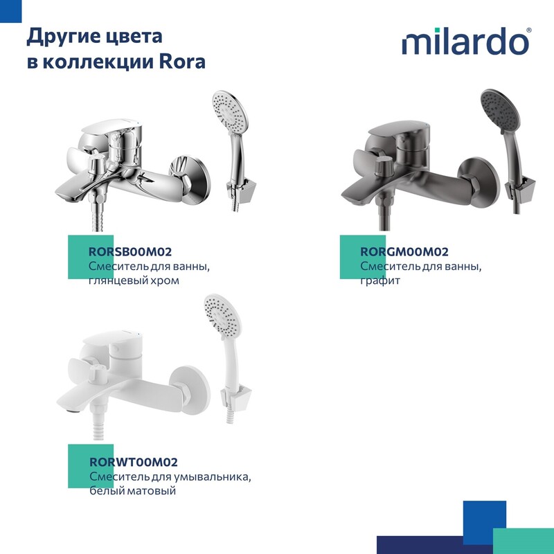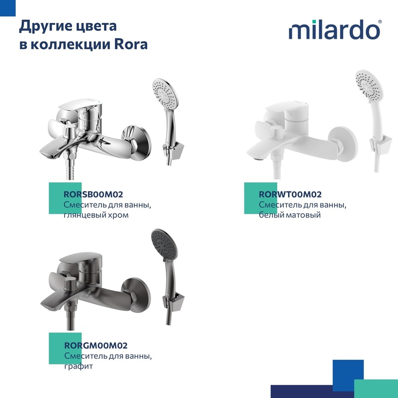 Смеситель для ванны Rora отличается универсальным характером: основной акцент в его дизайне приходится на плавные линии корпуса и трендовый черный цвет. Модель с коротким фиксированным изливом надежна и удобна в ежедневном использовании. Интенсивность и температура потока легко регулируются удобной ручкой смесителя. Поворотный дивертор работает при любом давлении воды, переключая поток воды на большую душевую лейку (ø 100 мм) или в комбинированном режиме. • Ручная лейка из прочного ABS-пластика, ПВХ-шланг (1,5 м) в оплетке из нержавеющей стали и крепеж идут в комплекте. • Качественный механизм смешивания воды смесителя Milardo® рассчитан на более чем 70 000 циклов работы – это не менее 15 лет эксплуатации семьей из трех человек. • Электрофоретическое матовое покрытие делает поверхность смесителя устойчивой к условиям высокой влажности – такой смеситель прослужит дольше и сохранит свой первоначальный внешний вид. • Гарантия на смеситель Milardo® – 7 лет, на картридж – 3 года, на душевые аксессуары – 1 год