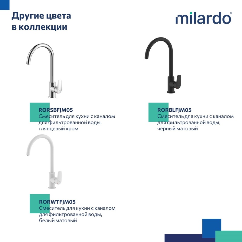 Смеситель для кухни Рора (Rora) с отдельным каналом для фильтрованной воды отличается универсальным характером: основной акцент в его дизайне приходится на плавные линии корпуса и трендовый цвет. Покрытие более редкого сатинового цвета способно придать более приятный теплый оттенок кухонной зоне. К нему можно подключить фильтр любого производителя и наслаждаться чистой водой прямо из смесителя. Переключение между режимами подачи воды осуществляется только одной ручкой. Модель не требует дополнительного отверстия в мойке под фильтр. Гибкая подводка и крепеж в комплекте. • Качественный механизм смешивания воды смесителя Milardo® рассчитан на более чем 70 000 циклов работы – это не менее 15 лет эксплуатации семьей из трех человек. • Покрытие смесителя нанесено методом вакуумного напыления (PVD-покрытие), при котором частички краски проникают глубоко в структуру металла. Подобная технология обеспечивает высокую стойкость цвета при негативном воздействии внешних факторов. • Гарантия на смеситель Milardo® – 7 лет, на картридж – 3 года. (с) Авторский текст, сентябрь 2022 г.