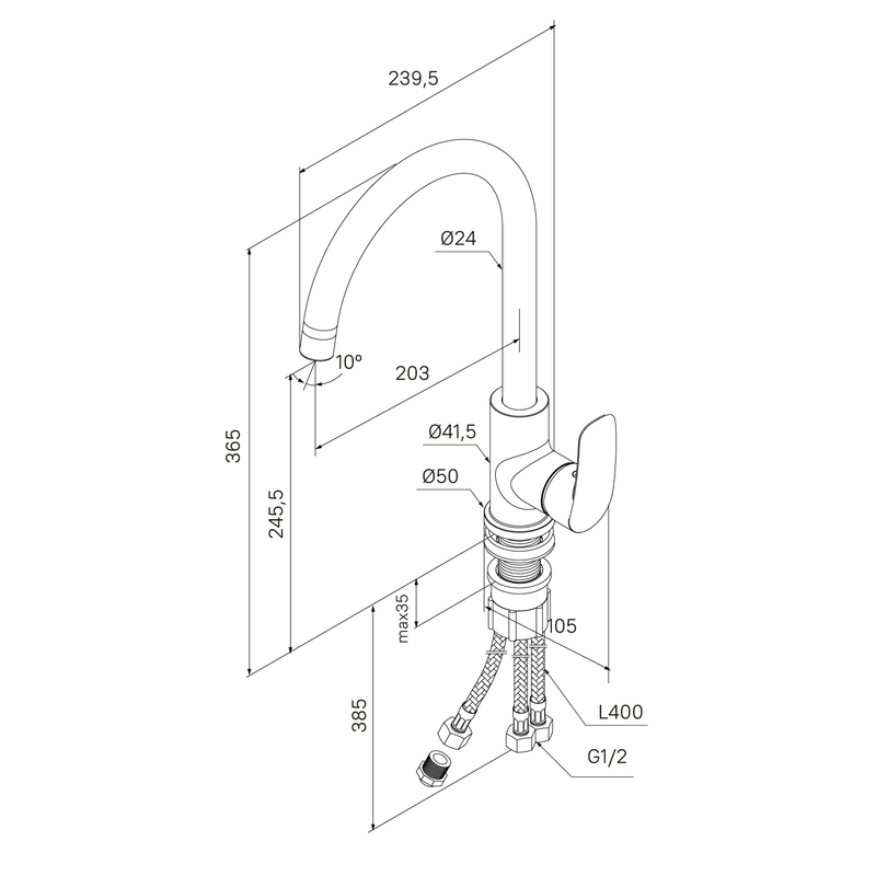 | Подключение к системе водоснабжения: | Гибкая подводка из нетоксичной EPDM резины в оплетке из нержавеющей стали, М10 - 1/2, длина 450 мм |