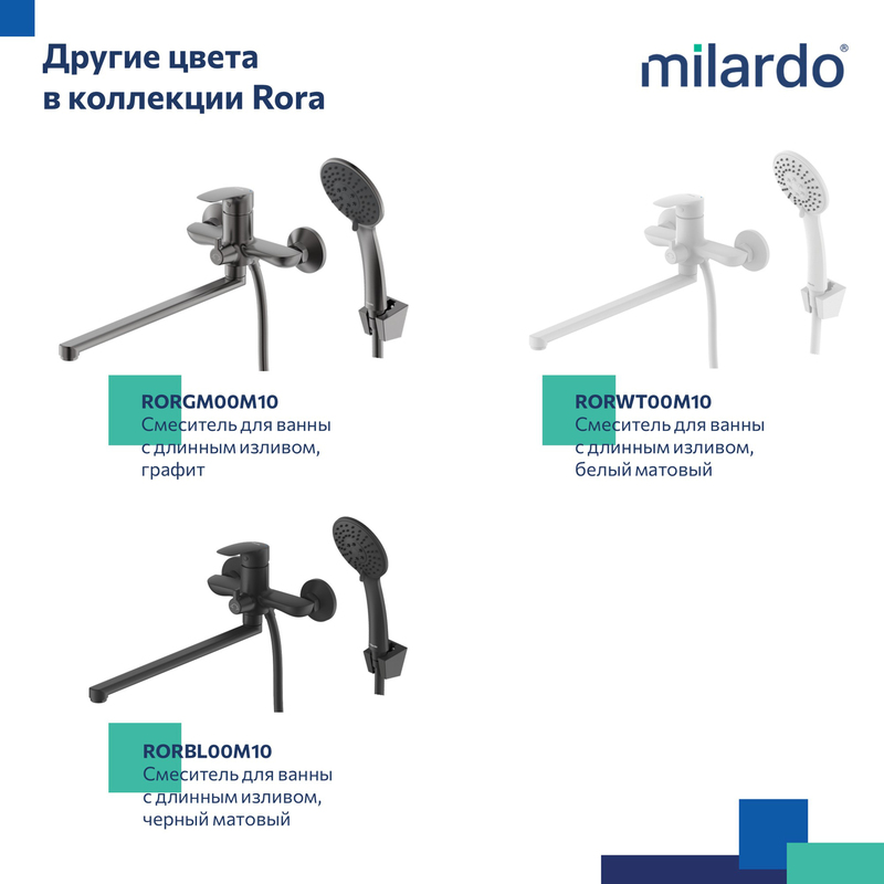 Смеситель для ванны Rora отличается универсальным характером: основной акцент в его дизайне приходится на плавные линии корпуса и классическое цветовое решение. Наличие длинного (35 см) излива позволяет использовать пространство ванны максимально эффективно. Интенсивность и температура потока легко регулируются удобной ручкой смесителя. Поворотный дивертор работает при любом давлении воды, переключая поток воды на большую душевую лейку (ø 100 мм) или в комбинированном режиме. • Ручная лейка из прочного ABS-пластика, ПВХ-шланг (1,5 м) в оплетке из нержавеющей стали и крепеж идут в комплекте. • Качественный механизм смешивания воды смесителя Milardo® рассчитан на более чем 70 000 циклов работы – это не менее 15 лет эксплуатации семьей из трех человек. • Оптимальная толщина никель-хромового покрытия защищает смеситель от образования трещин и сколов, продлевает срок его службы. • Гарантия на смеситель Milardo® – 7 лет, на картридж – 3 года, на душевые аксессуары – 1 год. (с) Авторский текст, сентябрь 2022 г