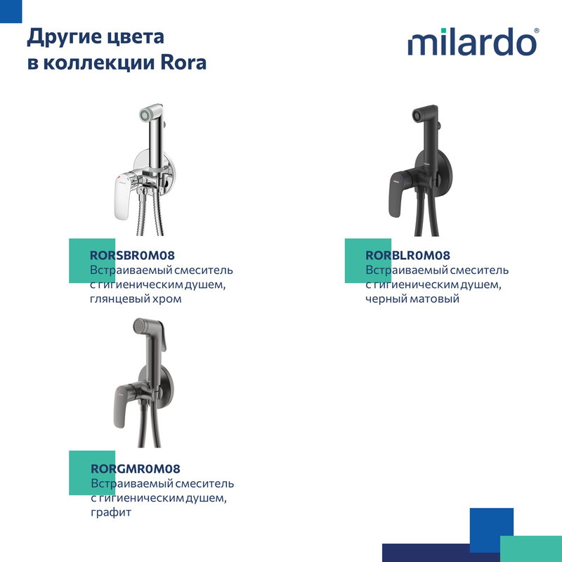 Смеситель с гигиеническим душем Rora отличается универсальным характером: основной акцент в его дизайне приходится на плавные линии корпуса и трендовый белый цвет. Держатель для лейки интегрирован в компактный корпус смесителя – удобно для санузлов небольшой площади. Простое рычажное управление позволяет управлять смесителем в одно движение. • Гигиеническая лейка из ABS-пластика и душевой шланг из ПВХ (1,5) идут в комплекте. • Качественный механизм смешивания воды смесителя Milardo® рассчитан на более чем 70 000 циклов работы – это не менее 15 лет эксплуатации семьей из трех человек. • Матовое покрытие делает поверхность смесителя устойчивой к условиям высокой влажности – такой смеситель прослужит дольше и сохранит свой первоначальный внешний вид. • Гарантия на смесители Milardo® – 7 лет, на картридж – 3 года, на душевые аксессуары – 1 год. (с) Авторский текст, сентябрь 2022 г.