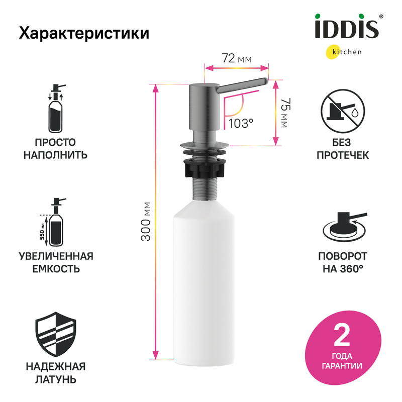 Встраиваемый в столешницу дозатор – незаменимый аксессуар для кухни, где ничто не должно отвлекать от красивого интерьера. Выглядит эстетично и занимает минимум места, освобождая его для действительно важных вещей. Трендовый цвет и универсальный дизайн сочетаются со смесителями и мойками IDDIS® и других производителей в тон. Отверстие для установки – 29-37 мм. • Прослужит долго: за счет надежного механизма-помпы, носика и насоса из латуни. • Легко наполнять – верхняя часть дозатора снимается без резьбы и удерживается уплотнительным кольцом. • Вместительная емкость 550 мл – не нужно часто доливать. • Долговечное покрытие, устойчивое к царапинам и бытовой химии. • Не подтекает – носик поднят вверх, оставшееся средство стекает обратно в колбу. Отверстие на носике снизу выглядит более эстетично. • Продуманная конструкция не собирает грязь – мало труднодоступных мест и лишних стыков, где она может скопиться. Гарантия на кухонные аксессуары IDDIS® – 2 года. (с) Авторский текст, декабрь 2023 г.