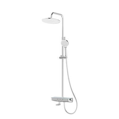 Хромированный смеситель для ванны с верхним душем Shelfy с дизайнерским корпусом с декоративными элементами из закаленного стекла и стильными белыми вставками. Технологичное и понятное кнопочное управление Push Control. Регулировка комфортной температуры воды производится поворотом ручки. • Оптимальный напор воды: 14 л/мин. из излива, 16 л/мин. из верхней лейки, 9 л/мин. из ручной лейки (при давлении 3 бар). • Небольшая полка на корпусе для любимых косметических средств. • Покрытие устойчиво к появлению царапин и потускнению (при должном уходе). На протяжении многих лет будет выглядеть как новое. • Силиконовый аэратор создает ровный и мягкий поток воды без брызг и легко очищается от загрязнений, ржавчины и известковых отложений — достаточно провести по нему пальцем. • Шланг из ПВХ (1,5 м), ручная лейка и держатель для лейки идут в комплекте. • Гарантия на смеситель IDDIS® – 10 лет, на аксессуары – 3 года. (с) Авторский текст, август 2022 г.