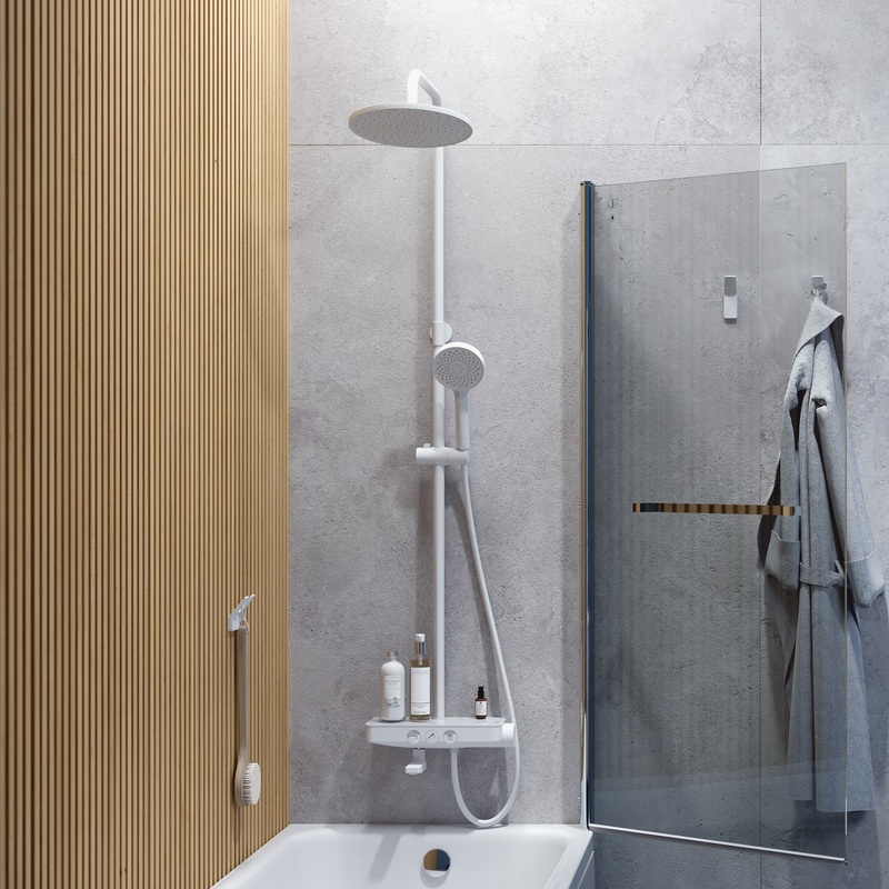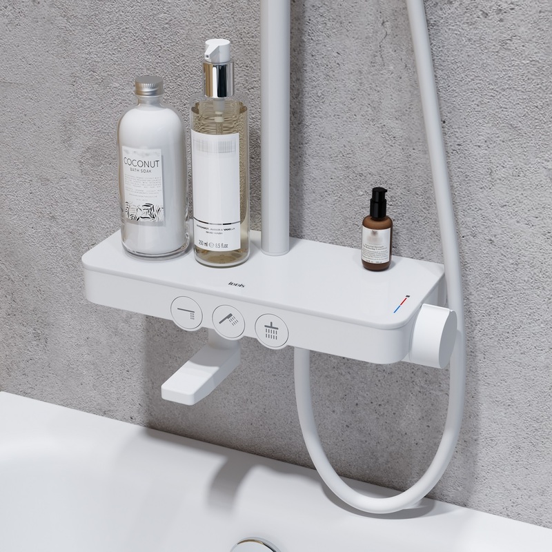 Стильный белый смеситель для ванны с верхним душем Shelfy с дизайнерским корпусом с декоративными элементами из закаленного стекла. Технологичное и понятное кнопочное управление Push Control. Регулировка комфортной температуры воды производится поворотом ручки. • Оптимальный напор воды: 14 л/мин. из излива, 16 л/мин. из верхней лейки, 9 л/мин. из ручной лейки (при давлении 3 бар). • Небольшая полка на корпусе для любимых косметических средств. • Покрытие устойчиво к появлению царапин и потускнению (при должном уходе). На протяжении многих лет будет выглядеть как новое. • Силиконовый аэратор создает ровный и мягкий поток воды без брызг и легко очищается от загрязнений, ржавчины и известковых отложений — достаточно провести по нему пальцем. • Шланг из ПВХ (1,5 м), ручная лейка и держатель для лейки идут в комплекте. • Гарантия на смеситель IDDIS® – 10 лет, на аксессуары – 3 года. (с) Авторский текст, август 2022 г.