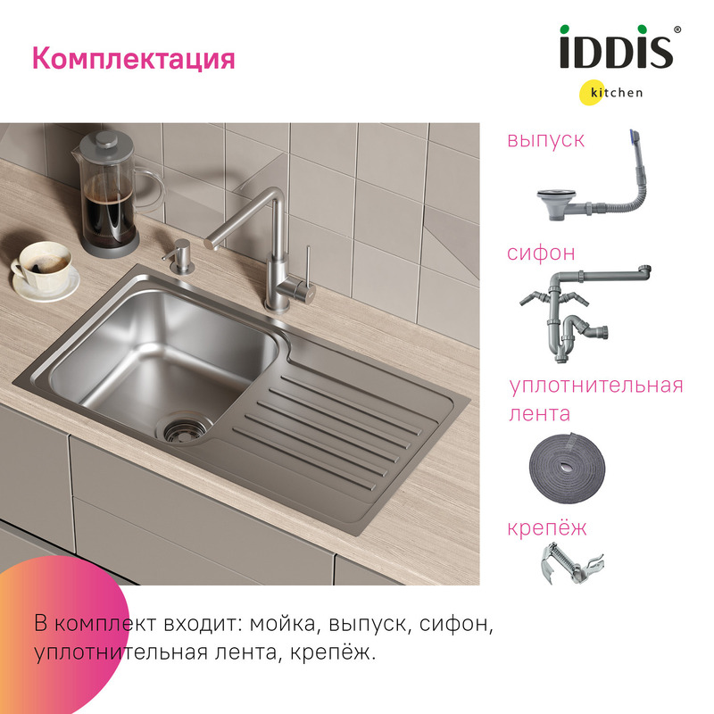 Мойка Sound – функциональность и актуальный дизайн, который подойдет почти к любой кухне. Крыло удобно использовать для сушки столовых приборов. Для шкафа от 45 см. • Устанавливается сверху в столешницу (вырез под мойку составляет 765х425хR20 мм). Подстольный монтаж не предусмотрен. Мойка оборачиваемая: крыло можно повернуть налево или направо. • Мойка из качественной нержавеющей стали AISI 304 толщиной 0,8 мм; сталь содержит 18% хрома и 8% никеля, что надежно защищает ее от коррозии. Стойкая к износу, выдерживает различные t, легко моется, долго служит. При правильном уходе надолго сохранит привлекательный внешний вид. • Текстура с эффектом шелковой поверхности благодаря специальной обработке. • Специальное антишумовое покрытие и полимерные накладки на обороте снижают шум при использовании. • Все необходимое для монтажа в комплекте: сифон, крепеж и шаблон для выреза в столешнице, эластичная уплотнительная лента для защиты от протечек. Гарантия на мойки IDDIS® – 15 лет, на крепления – 1 год. (с) Авторский текст, декабрь 2025 г.