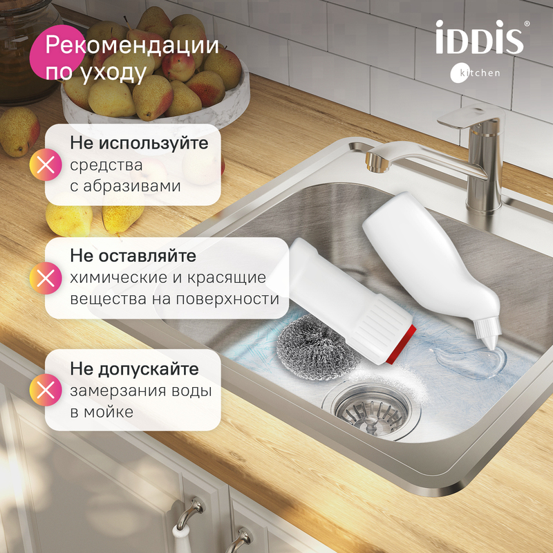 Мойка Strit из популярной коллекции удобных кухонных моек разной функциональности. Имеет одну чашу и площадку под моющее средство, отлично дополнит любую кухню. Подходит к тумбе от 50 см. • Мойка из качественной нержавеющей стали AISI 304 толщиной 0,8 мм; сталь содержит 18% хрома и 8% никеля, что надежно защищает ее от коррозии. Стойкая к износу, выдерживает различные t, легко моется, долго служит. При правильном уходе надолго сохранит привлекательный внешний вид. • Текстура с эффектом шелковой поверхности благодаря специальной обработке стали. • Специальное антишумовое покрытие и полимерные накладки на обороте снижают шум при использовании. • Все необходимое для монтажа в комплекте: крепления для врезного монтажа (вырез под мойку составляет 470х470хR35 мм), шаблон для выреза в столешнице и эластичная уплотнительная лента для защиты от протечек. Подстольный монтаж не предусмотрен. • Сифон приобретается отдельно. Рекомендуем использовать сифон с выпуском 3.1/2"x 40 мм с переливом и отводом, арт.: 900CVG1P10VD или сифон с выпуском 3.1/2"x 40 мм с переливом, арт.: 900CVG0P10VD. Гарантия на мойки IDDIS® – 15 лет, на крепления - 1 год. (с) Авторский текст, декабрь 2025 г.