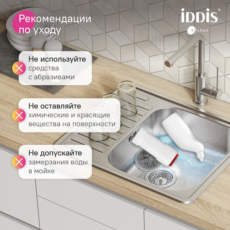 Мойка Strit из популярной коллекции удобных кухонных моек разной функциональности. Имеет компактное крыло с геометричным узором – для размораживания продуктов и сушки столовых приборов. Подходит к тумбе от 45 см. • Мойка из качественной нержавеющей стали AISI 304; сталь содержит 18% хрома и 8% никеля, что надежно защищает ее от коррозии. Стойкая к износу, выдерживает различные t, легко моется, долго служит. При правильном уходе надолго сохранит привлекательный внешний вид. • Текстура с эффектом шелковой поверхности благодаря специальной обработке стали. • Специальное антишумовое покрытие и полимерные накладки на обороте снижают шум при использовании. • Монтаж максимально удобен и универсален: она устанавливается сверху в столешницу врезным способом (вырез под мойку составляет 465х565хR35 мм) – крылом налево или направо. Подстольный монтаж не предусмотрен. • Все необходимое для монтажа в комплекте: крепеж и шаблон для выреза в столешнице, эластичная уплотнительная лента для защиты от протечек. • Сифон приобретается отдельно. Рекомендуем использовать сифон с выпуском 3.1/2"x 40 мм с переливом и отводом, арт.: 900CVG1P10VD или сифон с выпуском 3.1/2"x 40 мм с переливом, арт.: 900CVG0P10VD. Гарантия на мойки IDDIS® – 15 лет, на крепления – 1 год. (с) Авторский текст, декабрь 2025 г.