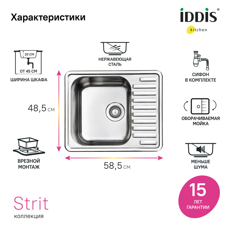 Мойка Strit из популярной коллекции удобных кухонных моек разной функциональности. Имеет компактное крыло с геометричным узором – для размораживания продуктов и сушки столовых приборов. Подходит к тумбе от 45 см. • Мойка из качественной нержавеющей стали AISI 304; сталь содержит 18% хрома и 8% никеля, что надежно защищает ее от коррозии. Стойкая к износу, выдерживает различные t, легко моется, долго служит. При правильном уходе надолго сохранит привлекательный внешний вид. • Текстура с эффектом шелковой поверхности благодаря специальной обработке стали. • Специальное антишумовое покрытие и полимерные накладки на обороте снижают шум при использовании. • Монтаж максимально удобен и универсален: она устанавливается сверху в столешницу – крылом налево или направо. • Все необходимое для монтажа в комплекте: сифон, крепеж и шаблон для выреза в столешнице, эластичная уплотнительная лента для защиты от протечек. Гарантия на мойки IDDIS® – 15 лет, на крепления и сифон – 1 год. (с) Авторский текст, апрель 2022 г.