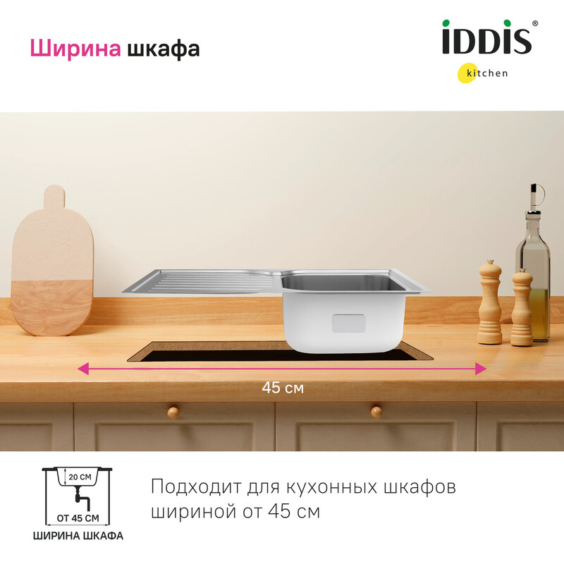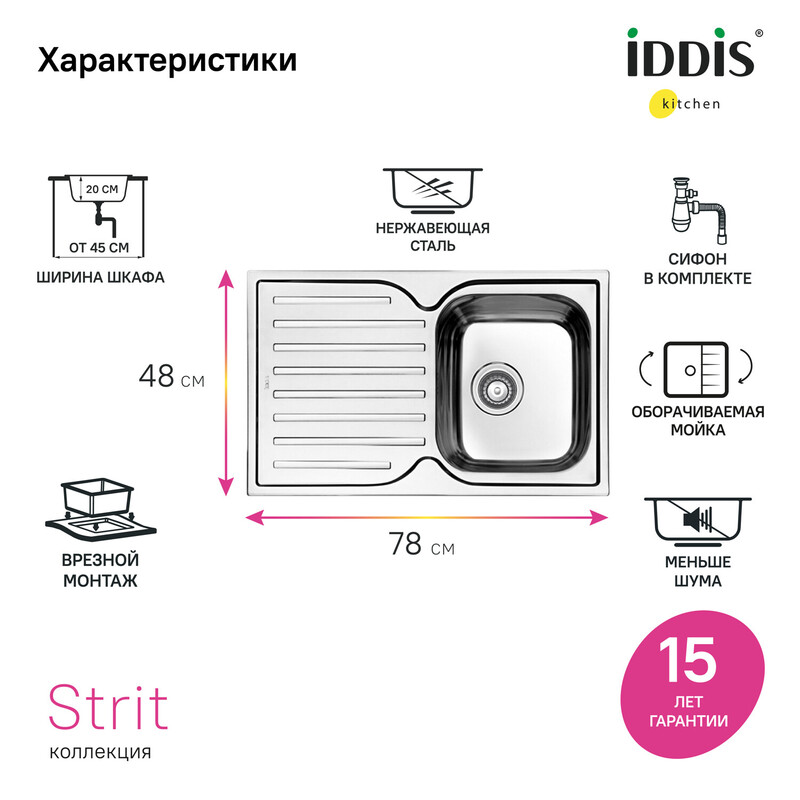 Мойка Strit из популярной коллекции удобных кухонных моек разной функциональности. Имеет компактное крыло с геометричным узором – для размораживания продуктов и сушки столовых приборов. Подходит к тумбе от 45 см. • Мойка из качественной нержавеющей стали AISI 304; сталь содержит 18% хрома и 8% никеля, что надежно защищает ее от коррозии. Стойкая к износу, выдерживает различные t, легко моется, долго служит. При правильном уходе надолго сохранит привлекательный внешний вид. • Текстура с эффектом шелковой поверхности благодаря специальной обработке стали. • Специальное антишумовое покрытие и полимерные накладки на обороте снижают шум при использовании. • Монтаж максимально удобен и универсален: она устанавливается сверху в столешницу – крылом налево или направо. • Все необходимое для монтажа в комплекте: сифон, крепеж и шаблон для выреза в столешнице, эластичная уплотнительная лента для защиты от протечек. • Гарантия на мойки IDDIS® – 15 лет, на крепления и сифон – 1 год. (с) Авторский текст, апрель 2022 г.