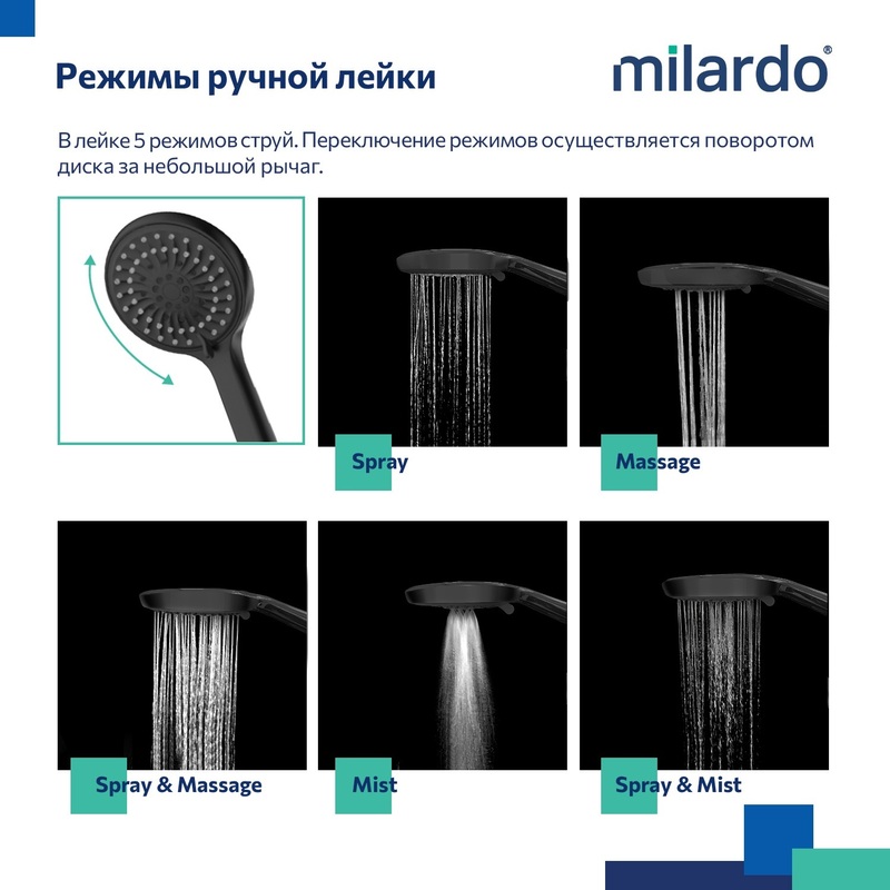 | Названия режимов лейки: | Spray, Massage, Mist, Spray & Massage, Spray & Mist |