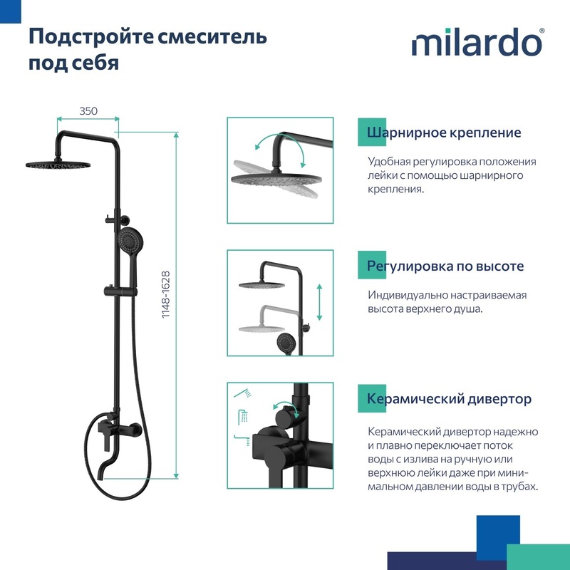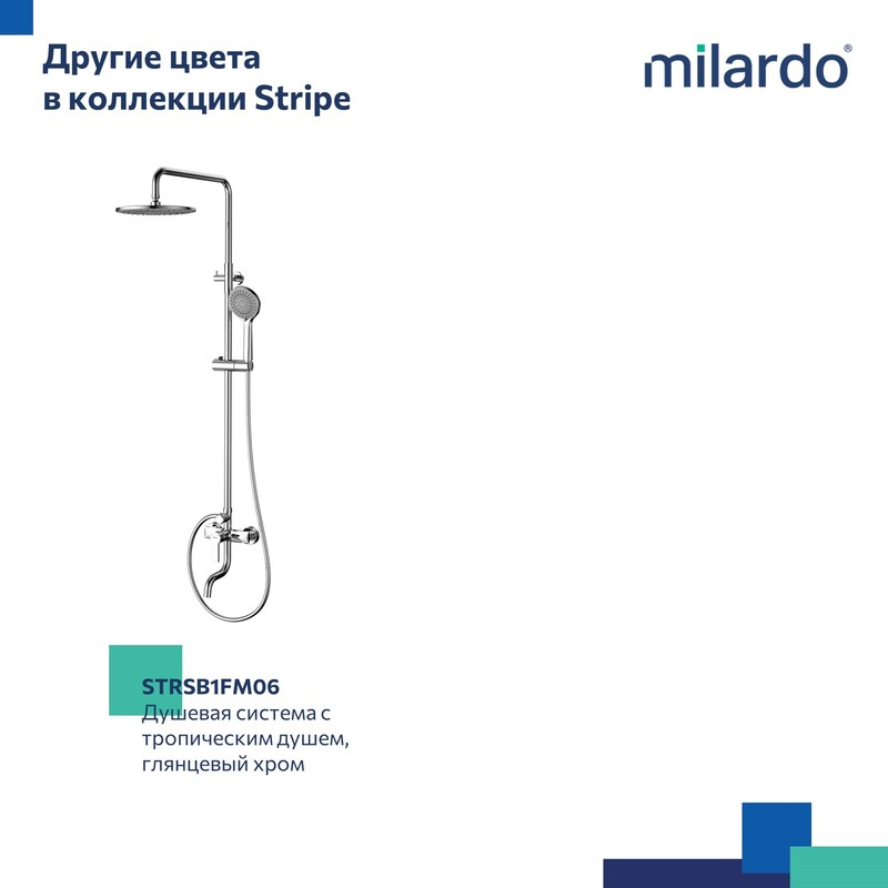 Душевая система Stripe выполнена в актуальном дизайне: она хорошо сочетается с современной сантехникой и разными стилями интерьера. Модель интересна изящным узором форсунок в виде закрученного водного вихря – тропический душ создает настроение своим эстетичным внешним видом. Отдельное внимание уделено функциональности душевой системы и комфорту от ее использования: верхняя и ручная лейки с продуманными пропорциями, стойка с регулируемой высотой и увеличенный вынос излива благодаря которому вода не попадает на бортик ванной. • В комплекте: верхняя насадка увеличенного диаметра (Ø250 мм), большая ручная лейка (ø 120 мм) с держателем, душевой шланг (1,5 м) и крепеж. • Качественный механизм смешивания воды смесителя Milardo® рассчитан на более чем 70 000 циклов работы – это не менее 15 лет эксплуатации семьей из трех человек. • Матовое покрытие в черном цвете устойчиво к появлению царапин и выцветанию (при правильном уходе) – такая сантехника дольше сохранит свой первоначальный внешний вид. • Гарантия на смесители Milardo® – 7 лет, на картридж – 3 года, на душевые аксессуары – 1 год. (с) Авторский текст, апрель 2025 г.