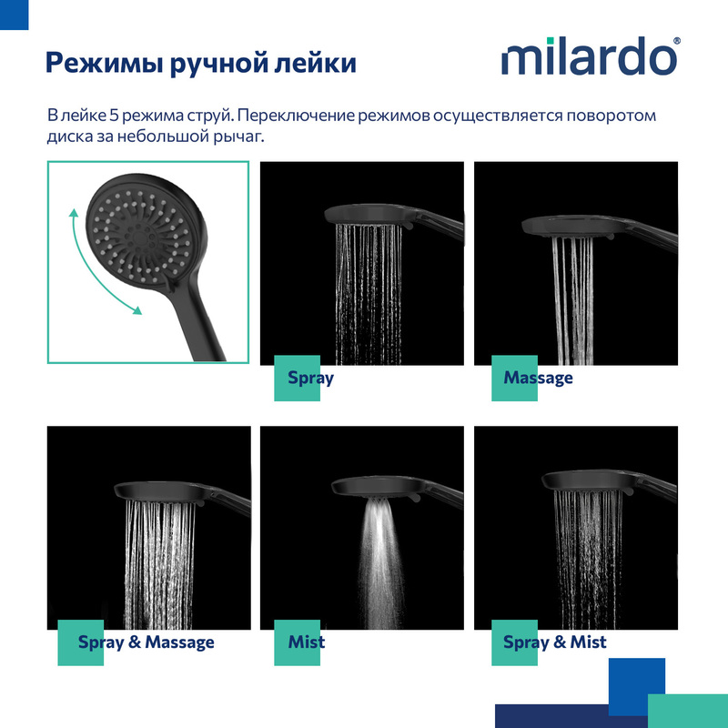 | Названия режимов лейки: | Spray, Massage, Spray&Massage, Strong spray, Spray&Strong spray |