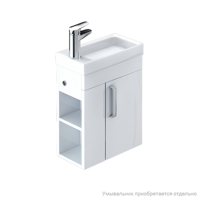 Тумба для ванной комнаты, подвесная. Размеры: 213х390х600 мм (ДхШхВ). Фасад ЛДСП 16 мм, боковины ЛДСП белый глянец. Одна распашная дверца, 2 открытые полки. Петли с доводчиком. Упаковка: картонная коробка.