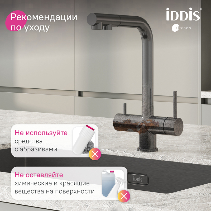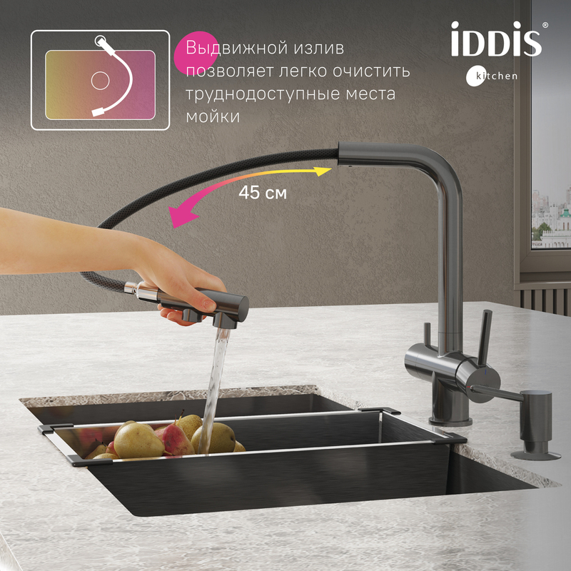 Смеситель Umbra в цвете графит – стильный дизайн и многофункциональность, необходимая на современной кухне. Удобная эргономичная ручка, питьевая вода из отдельного встроенного канала для фильтрованной воды и выдвижной излив – детали, которые сделают ежедневные хлопоты приятными. • Удобное управление водопроводной и фильтрованной водой с помощью двух отдельных ручек. • Выдвижная лейка с защитой от перекручивания облегчает мытье раковины и крупной посуды. • Надежный корпус из прочной латуни — стойкий к коррозии, резким изменениям давления и перепадам температуры воды. • В комплекте ключ для монтажа гибкой подводки. • Покрытие устойчиво к появлению царапин и потускнению (при должном уходе). На протяжении многих лет он будет выглядеть как новый. Фильтр приобретается отдельно. Гарантия на смесители IDDIS® — 10 лет. (с) Авторский текст, декабрь 2024 г.