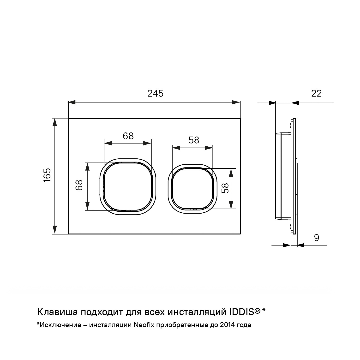 Хромированная клавиша IDDIS® Unifix составит базовый комплект с подвесной сантехникой – подходит ко всем инсталляциям IDDIS®, кроме инсталляции Neofix в модификации, продававшейся до 2014 года (см. на фото). Хромированный контур квадратных кнопок выступает ярким акцентом, превращая функциональный продукт в стильный аксессуар. Плоская и эстетичная клавиша смыва легко монтируется и снимается для удобного доступа к крану открытия-закрытия воды и обслуживания арматуры. Данная модель представлена в нескольких цветовых сочетаниях. • Хромированное покрытие клавиши смыва IDDIS® устойчиво к появлению царапин и потускнению. На протяжении многих лет она будет выглядеть как новая. • Клавиша смыва IDDIS® прослужит дольше благодаря прочному и износостойкому пластику и надежному креплению рамки на шурупы. • Технология двухрежимного смыва (малым или большим объемом) обеспечивает ощутимую экономию потребления воды. Гарантия на все клавиши IDDIS® – 3 года. (с) Авторский текст, октябрь 2025 г.